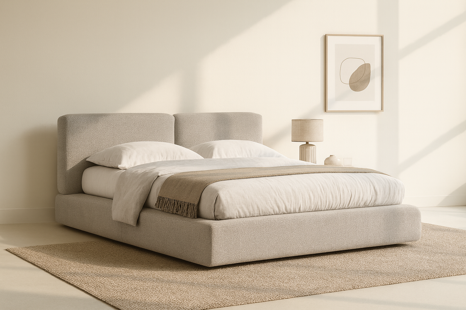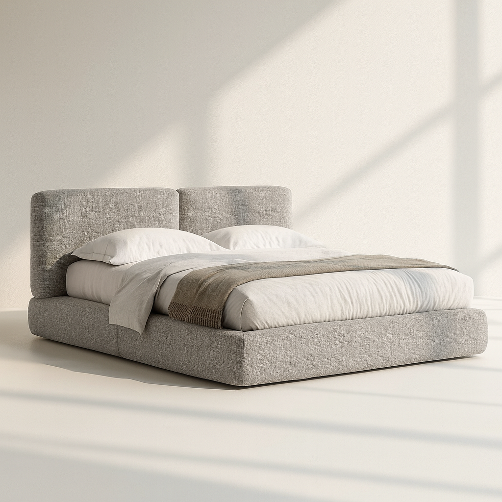 Ein Bett mit ausgewogener Struktur, das durch seine geometrische Präzision Ruhe und Stabilität vermittelt.