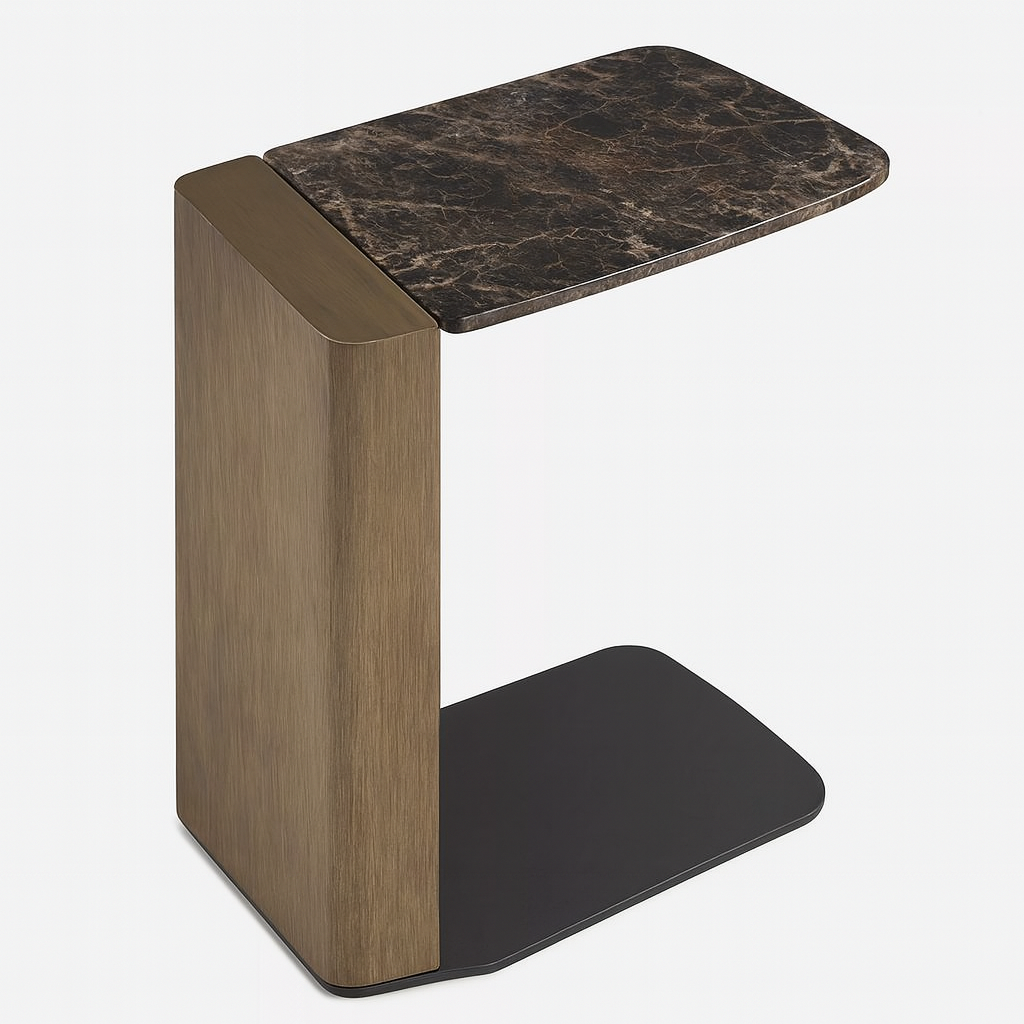 Tischplatte aus Marmor mit MDF-Korpus in Holzfurnier und matter Metallbasis.