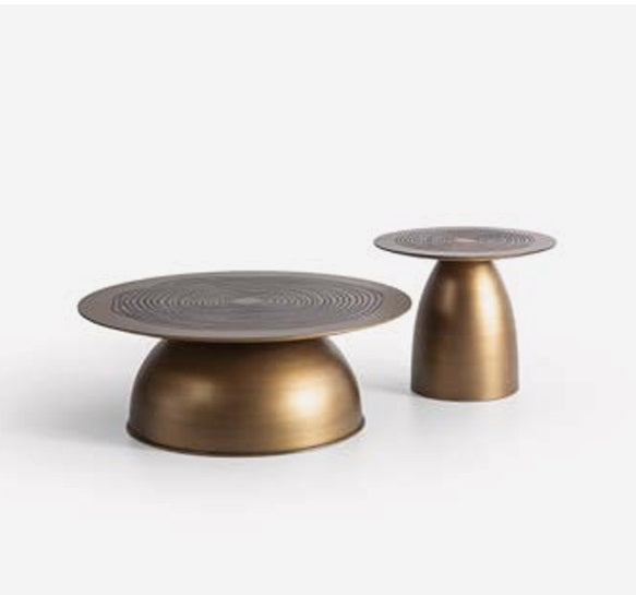 MDF-Tischplatte mit messingfarbenem Metallkorpus.
