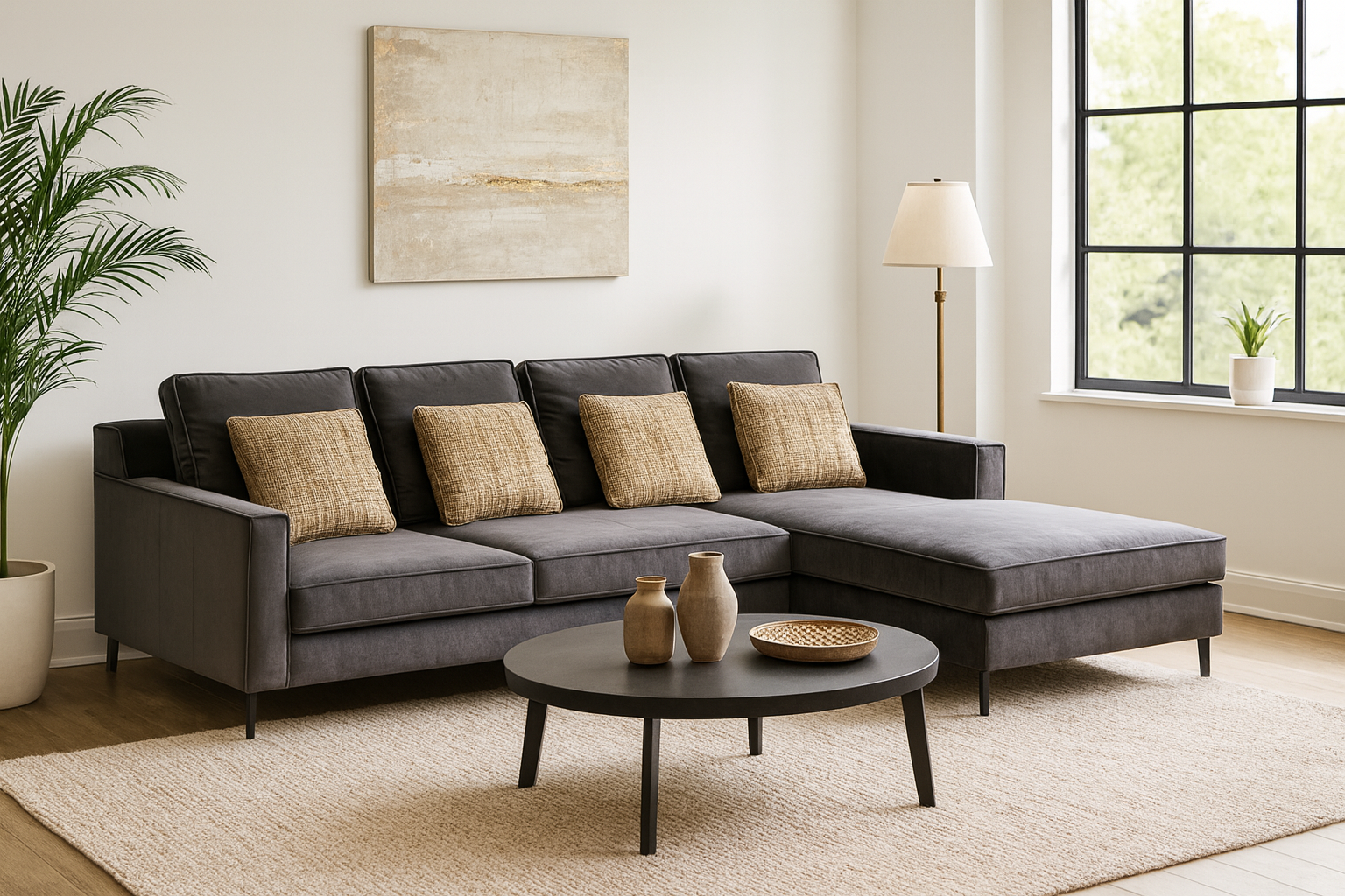Ein Sofa mit klarer Linienführung, das Ruhe und Balance ausstrahlt. Für zeitlose Raumkonzepte.