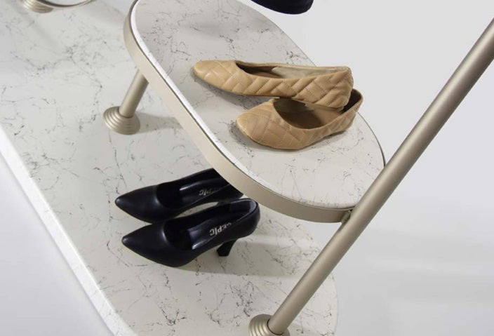 Regalböden mit marmorähnlicher Beschichtung und Metallrahmen.
