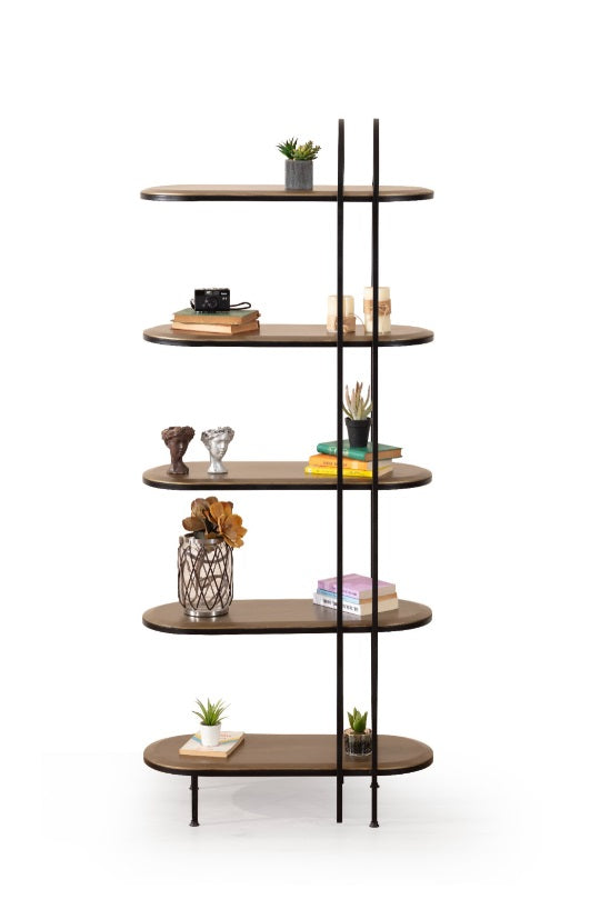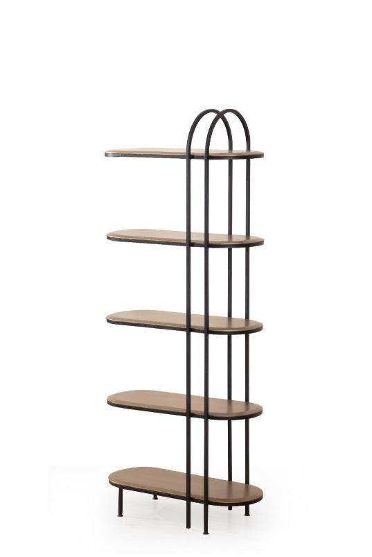Vollständig aus Metall gefertigter Korpus mit MDF-Regalen in Holzfurnier.